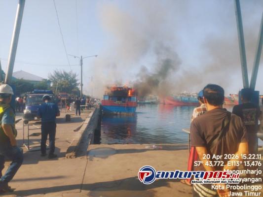 Probolinggo – Kapal penangkap ikan Gracias Tanjung Perak dilalap api di bagian buritan dan anjungan saat bersandar di Pelabuhan Perikanan Mayangan, Kota Probolinggo, Senin (20/4/2026).