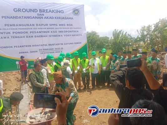 Demak, 24 Februari 2025 – Sebuah langkah besar dalam pemenuhan gizi santri di Jawa Tengah dan DIY resmi dimulai! Pondok Pesantren Hidayatul Mubtadi’in Sayung, Demak, menjadi saksi momen bersejarah dengan pelaksanaan ground breaking dan penandatanganan akad kerjasama pembangunan Dapur Satuan Pelayanan Pemenuhan Gizi (SPPG) Makan Bergizi Gratis (MBG) oleh Badan Gizi Nasional (BGN) dan Induk Koperasi Pondok Pesantren (Inkopontren).